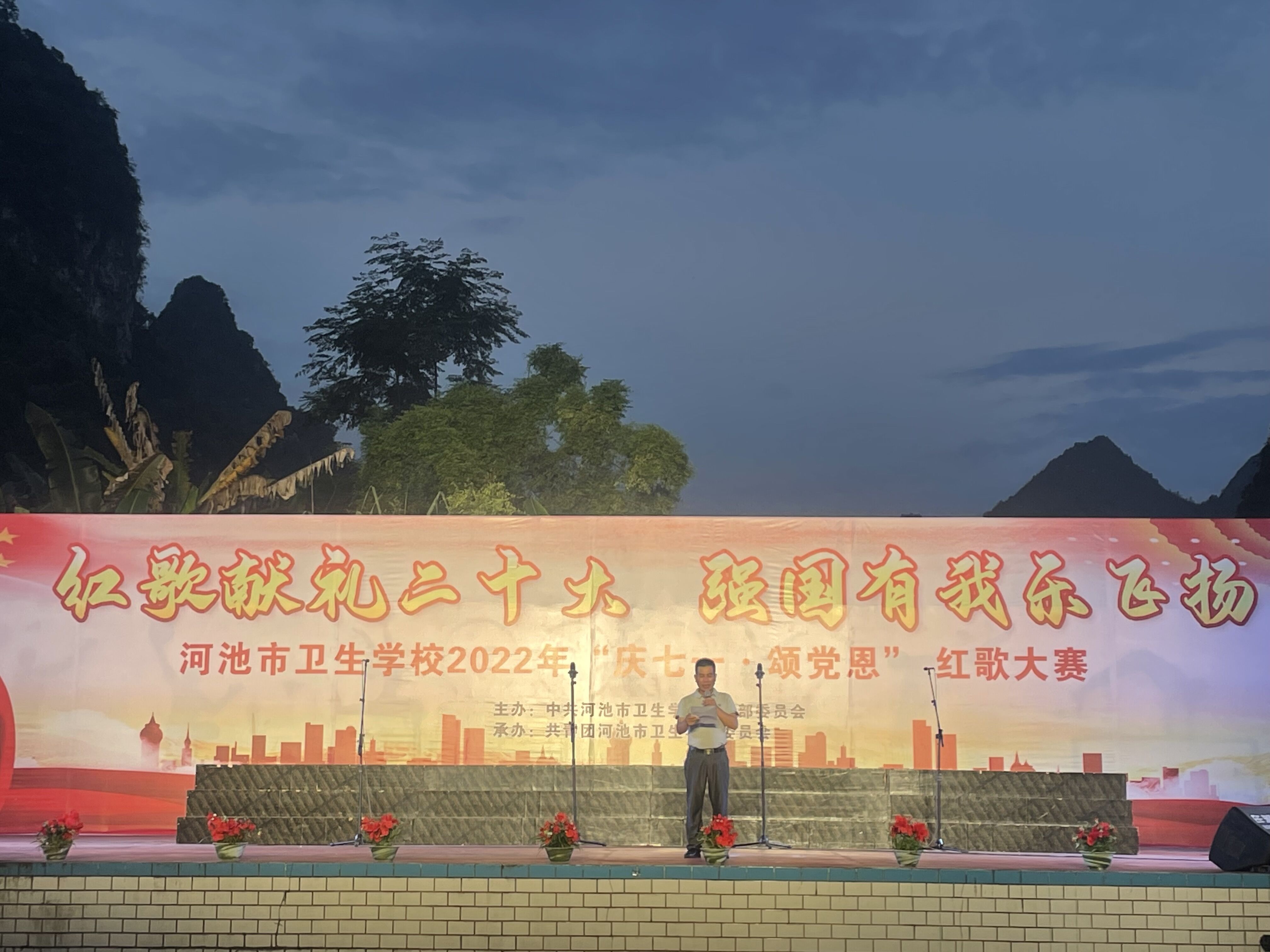 6月30日,为纪念建党101周年和迎接党的二十大的胜利召开,河池市卫生学校举办2022年“红歌献礼二十大,强国有我乐飞扬”红歌大赛。学校领导、各科室负责人及21级学生、班主任共同观看了比赛。