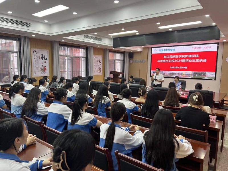 近日,右江民族医学院护理学院党委副书记黄上峰、科研与研究生管理科科长麻新灵、辅导员罗丽玲一行三人到河池市卫生学校开展高职毕业生就业推进会。河池卫校校长陈朝亮,副校长莫苗、周轩,招生就业办公室主任黄鸿宇及班主任代表出席会议。