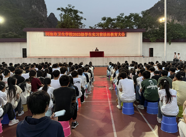 为强化学生法治观念,筑牢实习安全防线,5月11日晚,河池市卫生学校组织2023级全体学生召开实习前法制教育大会。活动特邀学校法律顾问韦朗舒律师担任主讲,通过理论讲解与案例分析相结合的方式,为即将踏上实习岗位的学子们上了一堂生动的法治课。