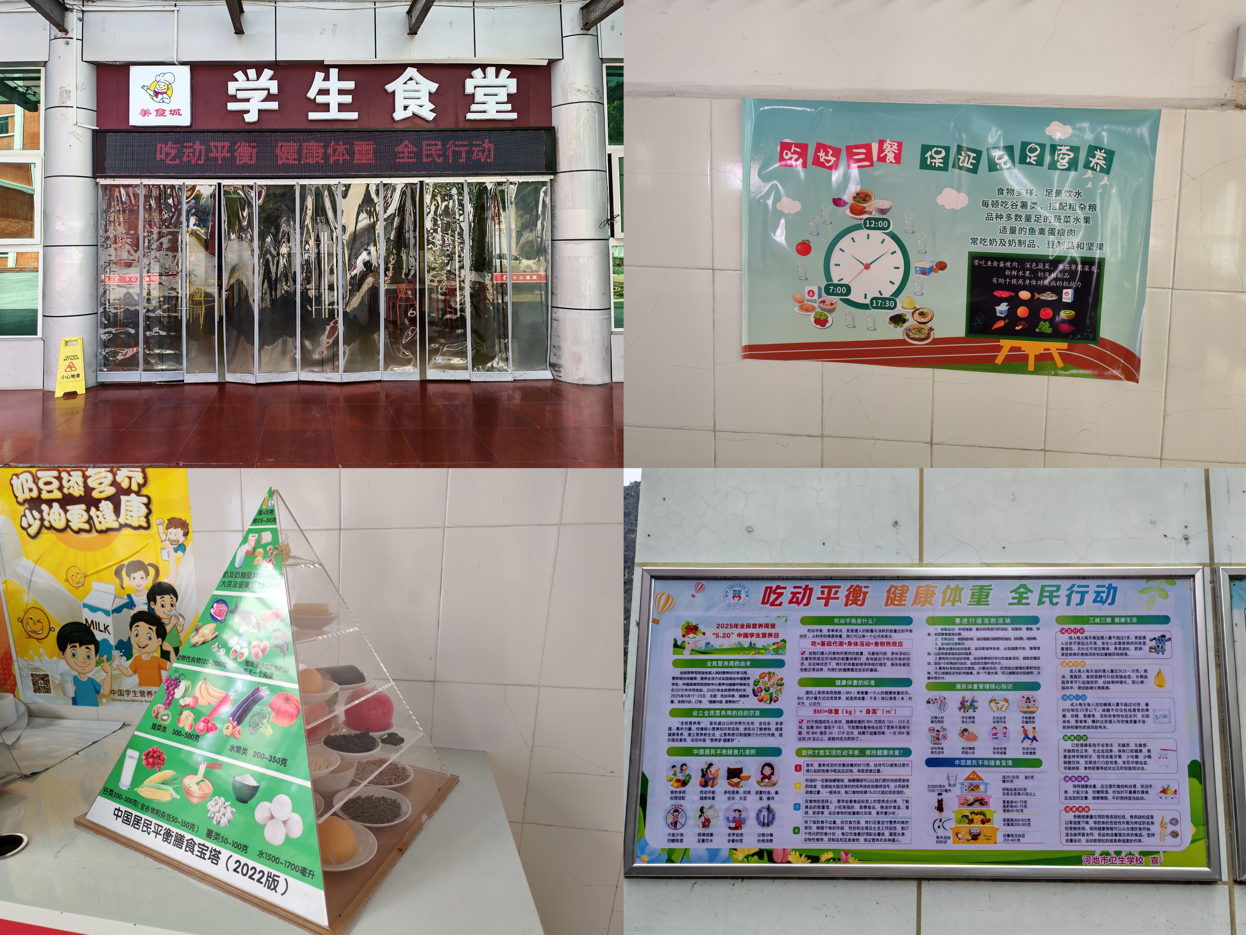 校园电子屏滚动播放营养健康标语,食堂区域布置膳食宝塔模型(标注每日摄入标准)及主题海报,将营养知识融入就餐场景,日均覆盖师生2000余人次,潜移默化传递健康理念。