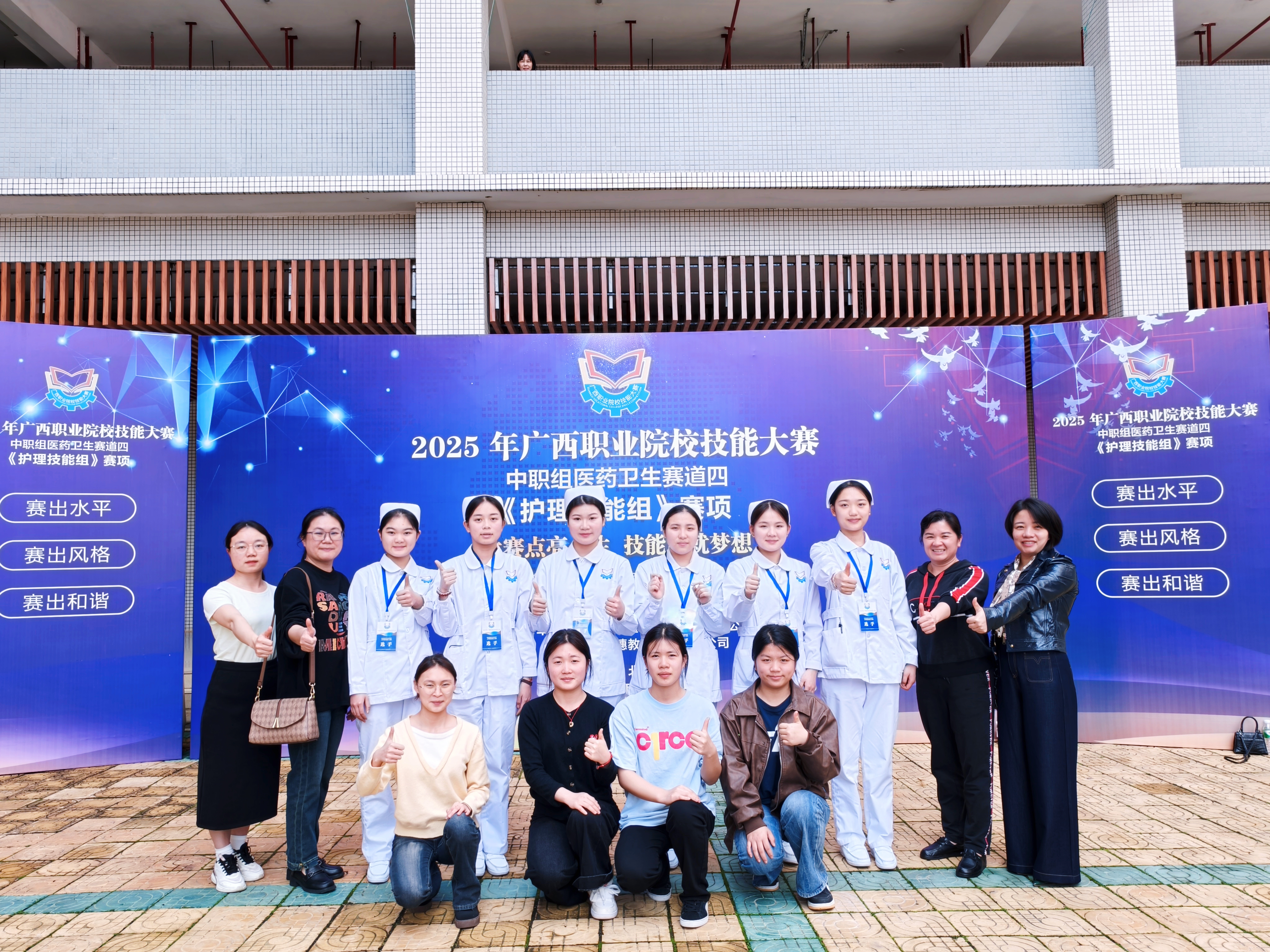 由兰芳芳、韦柳华老师指导的谢春丽、吴金怡、谢芷萱团队,莫苗、裴梦江老师指导的周佳玉、韦黄、罗冰馨团队,参加《护理技能》赛项的比赛,双双荣获银奖。
