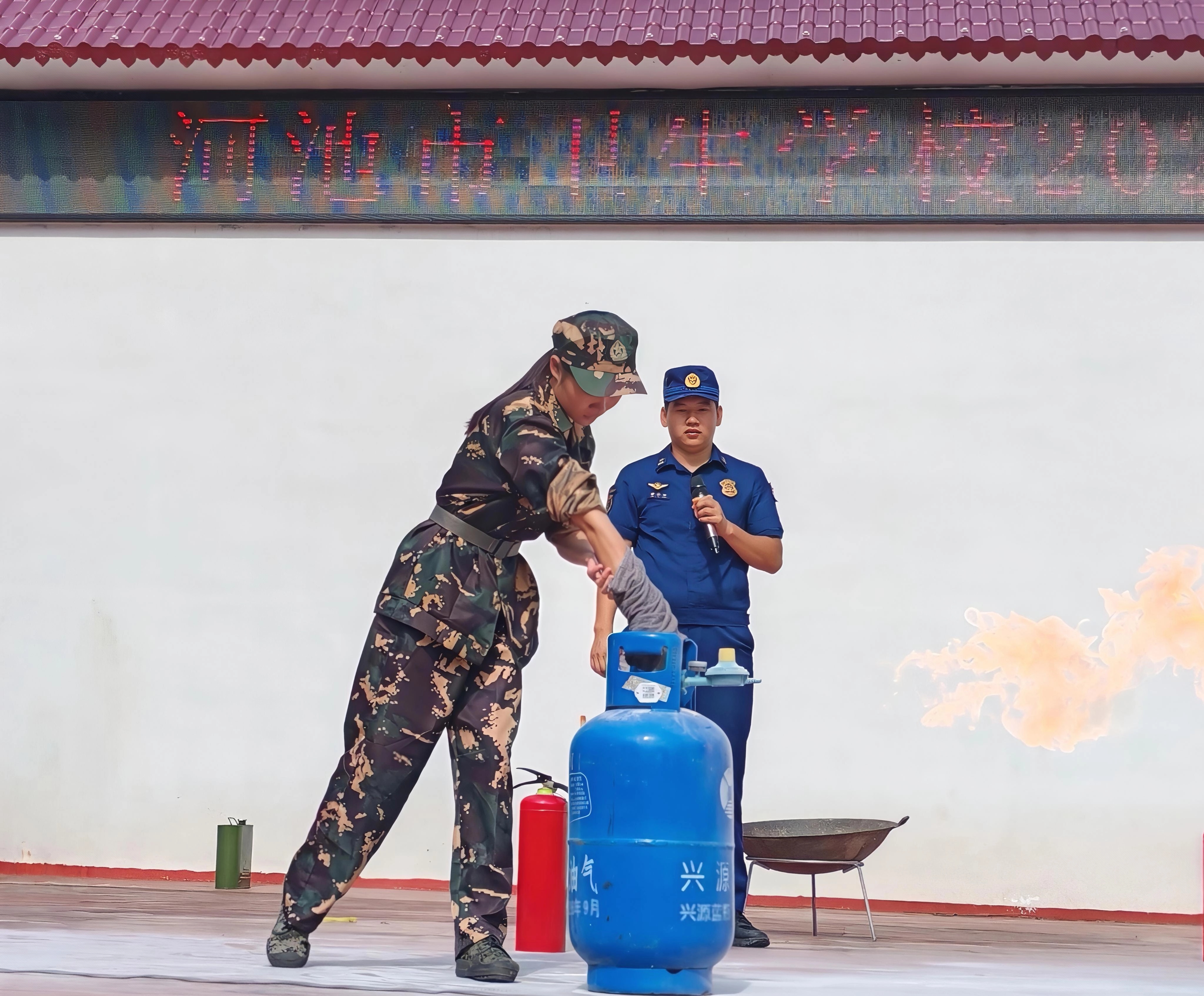 疏散结束后,河池市消防支队官兵为师生带来一场实用生动的消防安全讲座。结合真实火灾案例,消防员详细讲解了火灾预防、初起扑救、逃生自救等关键知识,重点演示了灭火器的正确使用方法,并通过“提、拔、握、压”四字口诀帮助师生轻松记忆操作要领。