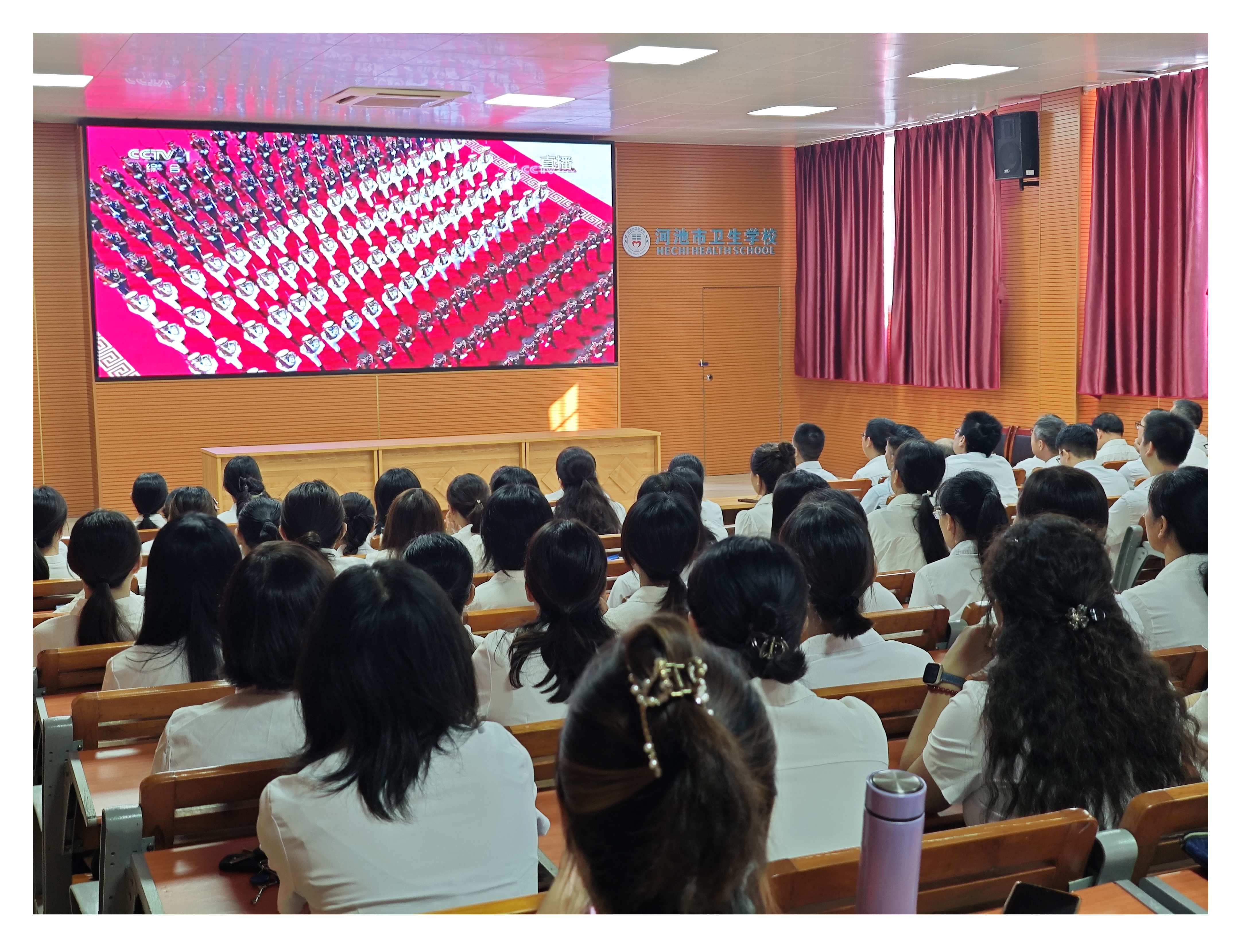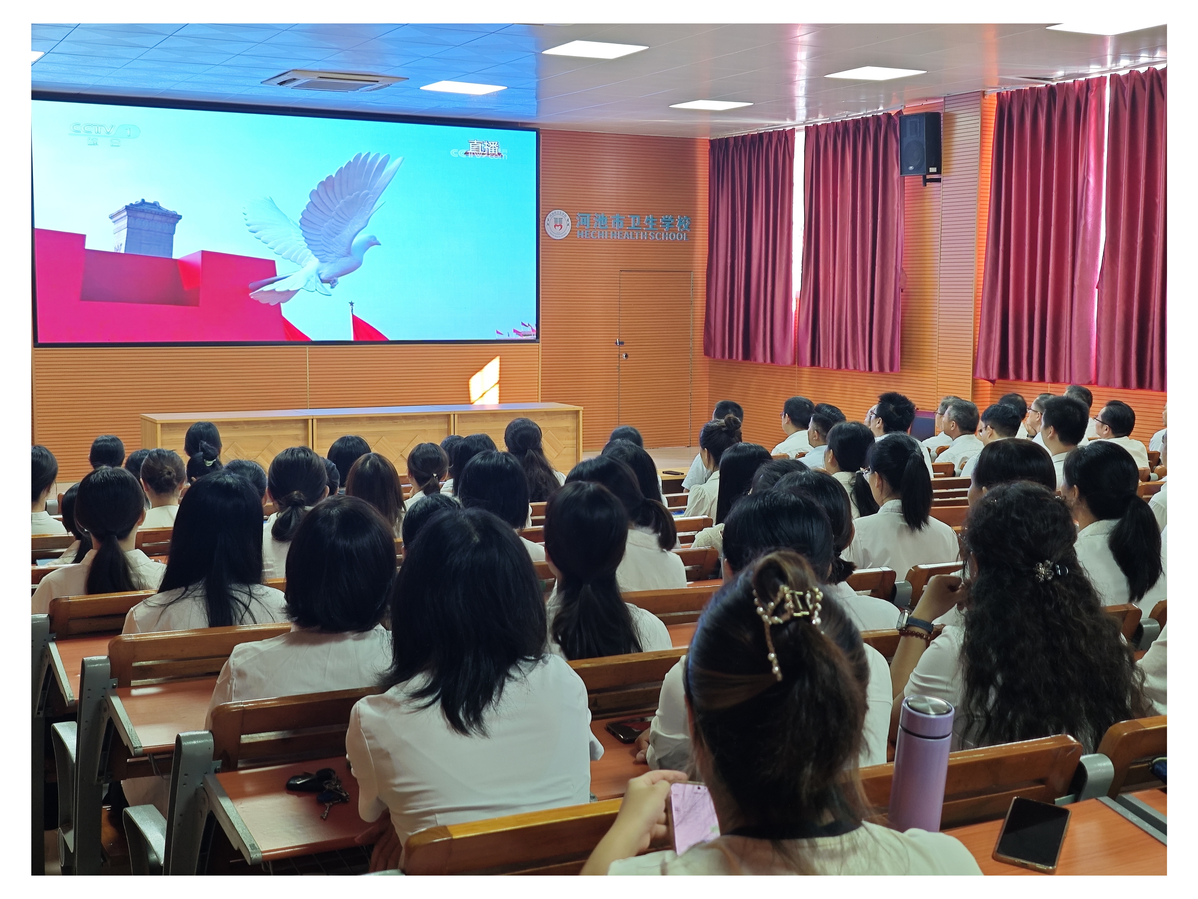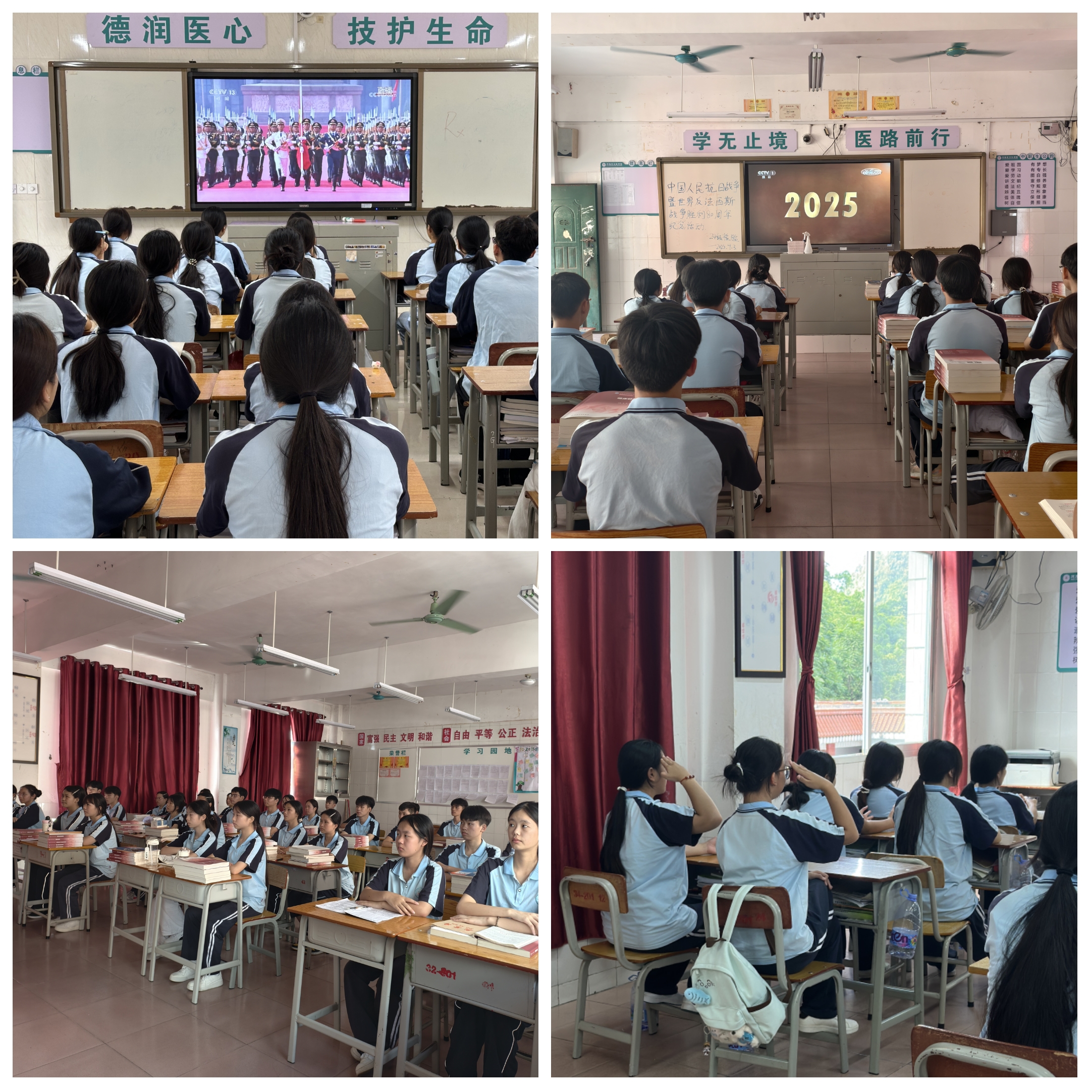 9月3日上午,纪念中国人民抗日战争暨世界反法西斯战争胜利80周年阅兵仪式在北京天安门广场隆重举行。河池市卫生学校组织全体教师齐聚第四阶梯教室,各班级学生在教室内同步收看直播。