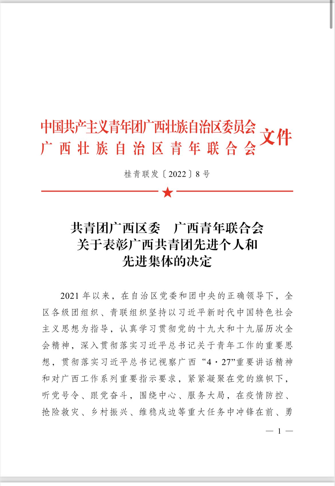 2022-05-23近日,从《共青团广西区委 广西青年联合会关于表彰广西共青团先进个人和先进集体的决定》(桂青联发〔2022〕8号)文件获悉,我校教师韦泽榜荣获2…